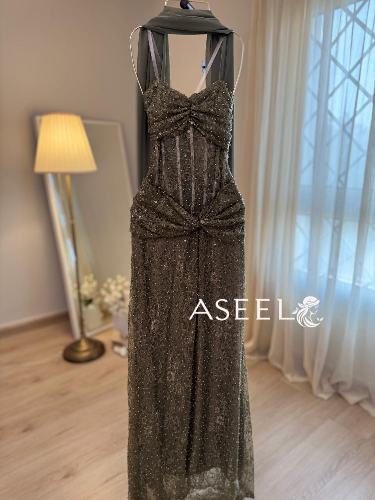 - اسم المنتج: فستان زيتي سهرة مطرز