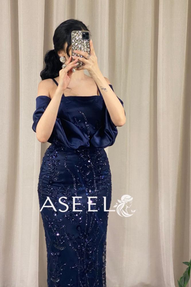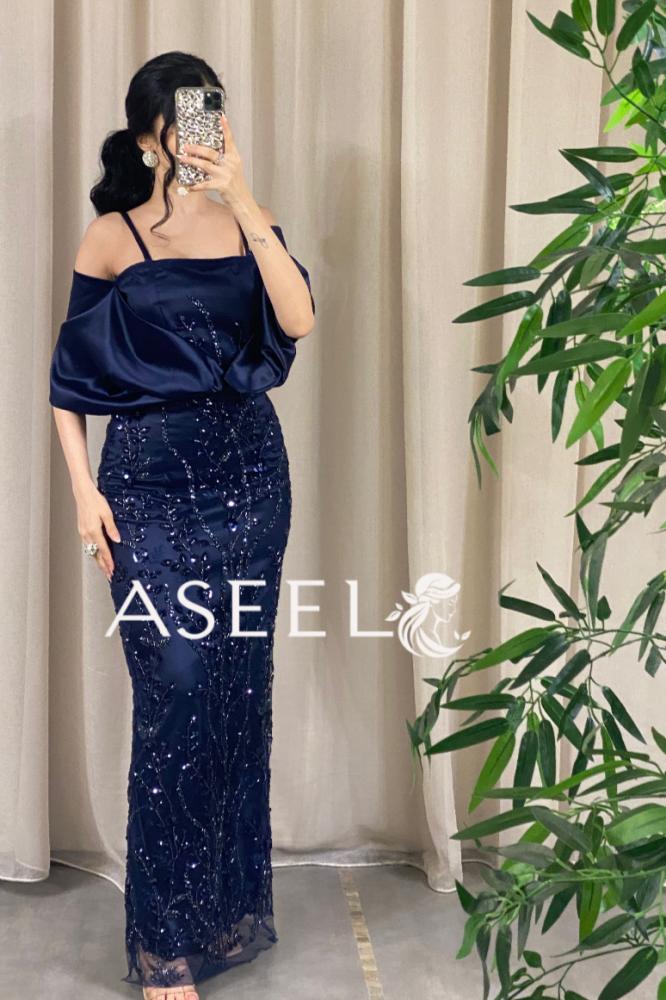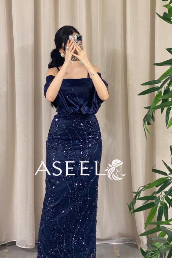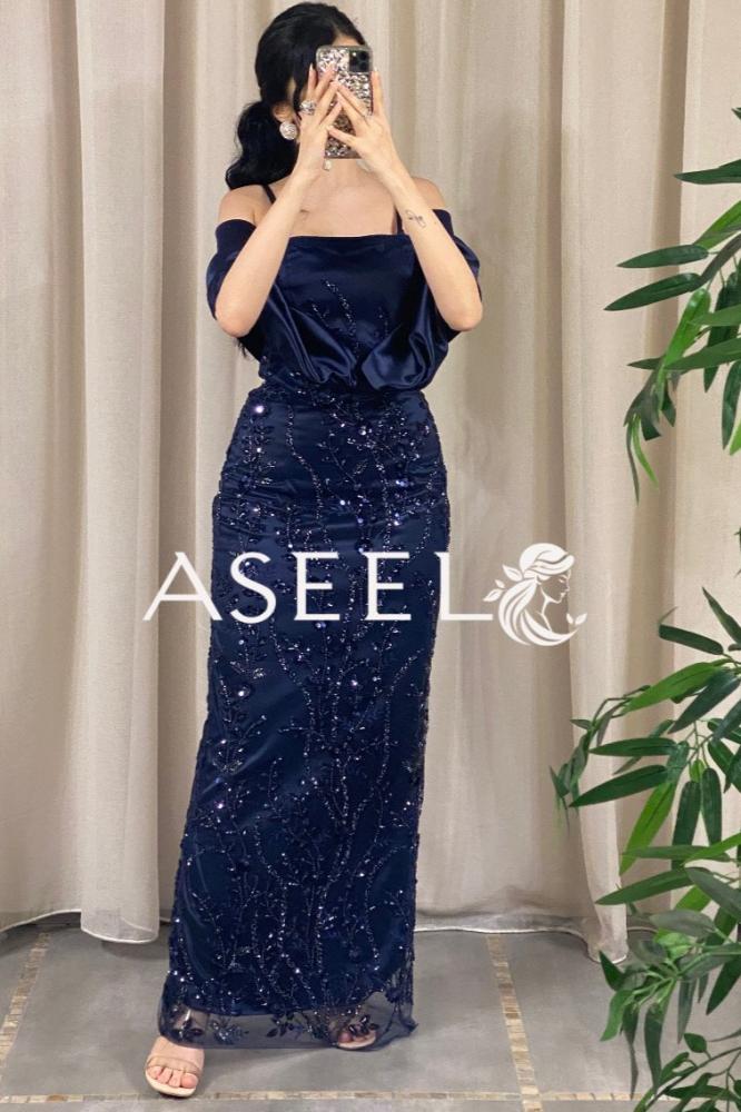 • فساتين كحلي سهره مزينة بتطريز فريد من نوعه يضفي لمسة من الجمال والتميز ويعزز من أناقة الإطلالة.