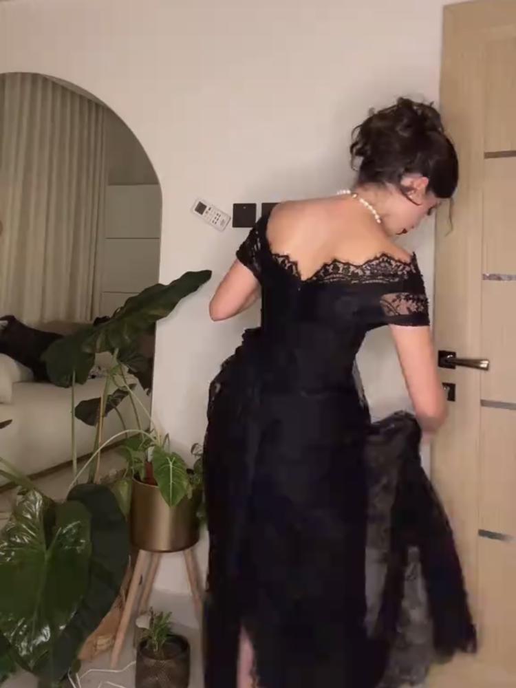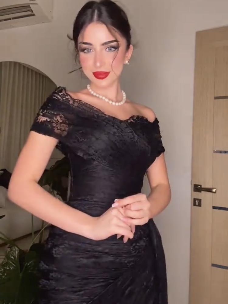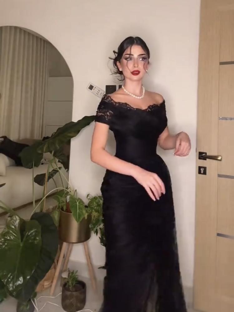 - فستان دانتيل اسود بتصميم أوف شولدر يبرز جمال الأكتاف ويضفي لمسة أنثوية جريئة وأنيقة